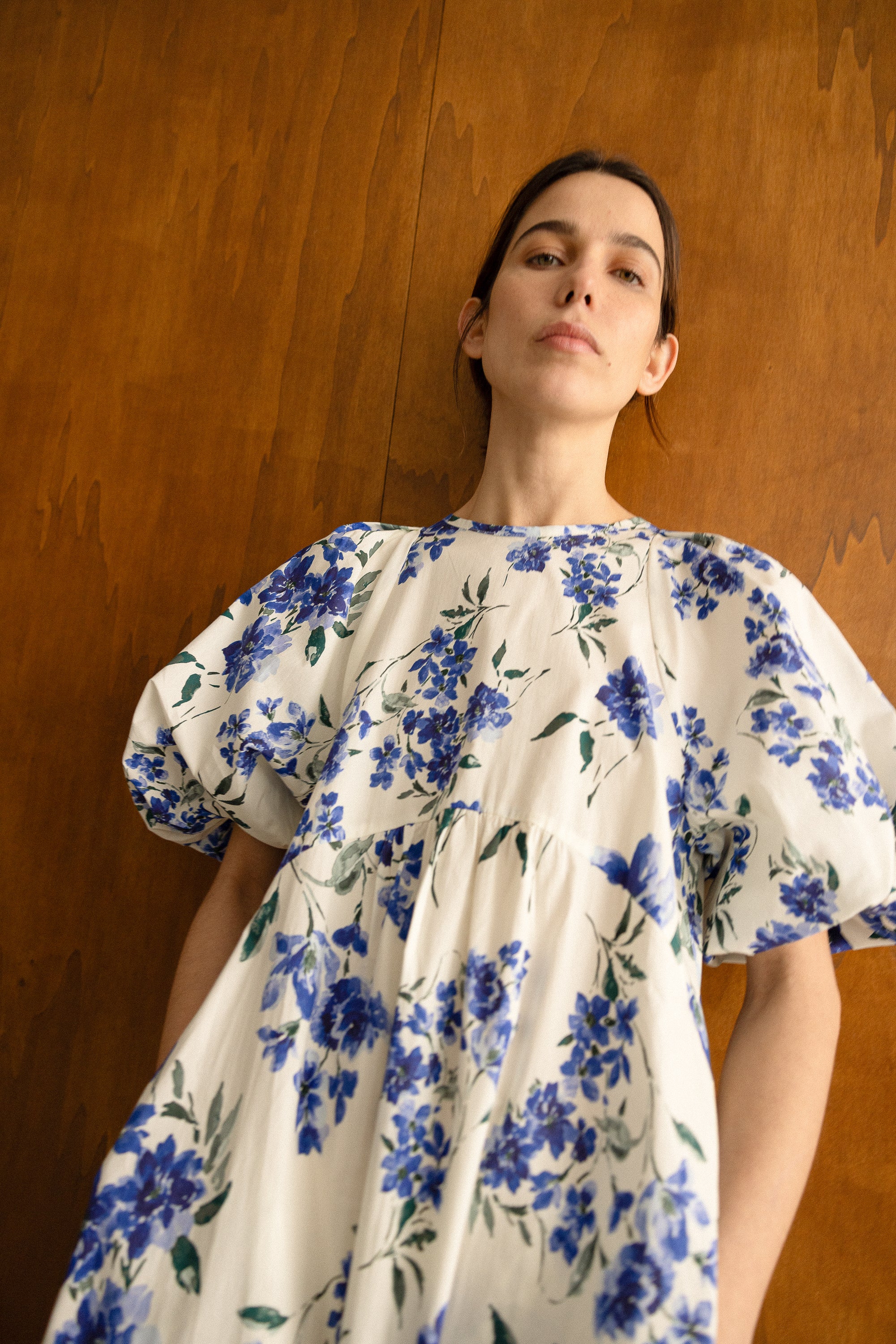 Este vestido presenta una silueta femenina, con mangas abullonadas, corte en el pecho y falda fluida. Combina la elegancia clásica con la ligereza contemporánea en una pieza que se adapta a cualquier ocasión sin perder su carácter. Confeccionado en un tejido 100% algodón con un estampado floral en blanco y azul.