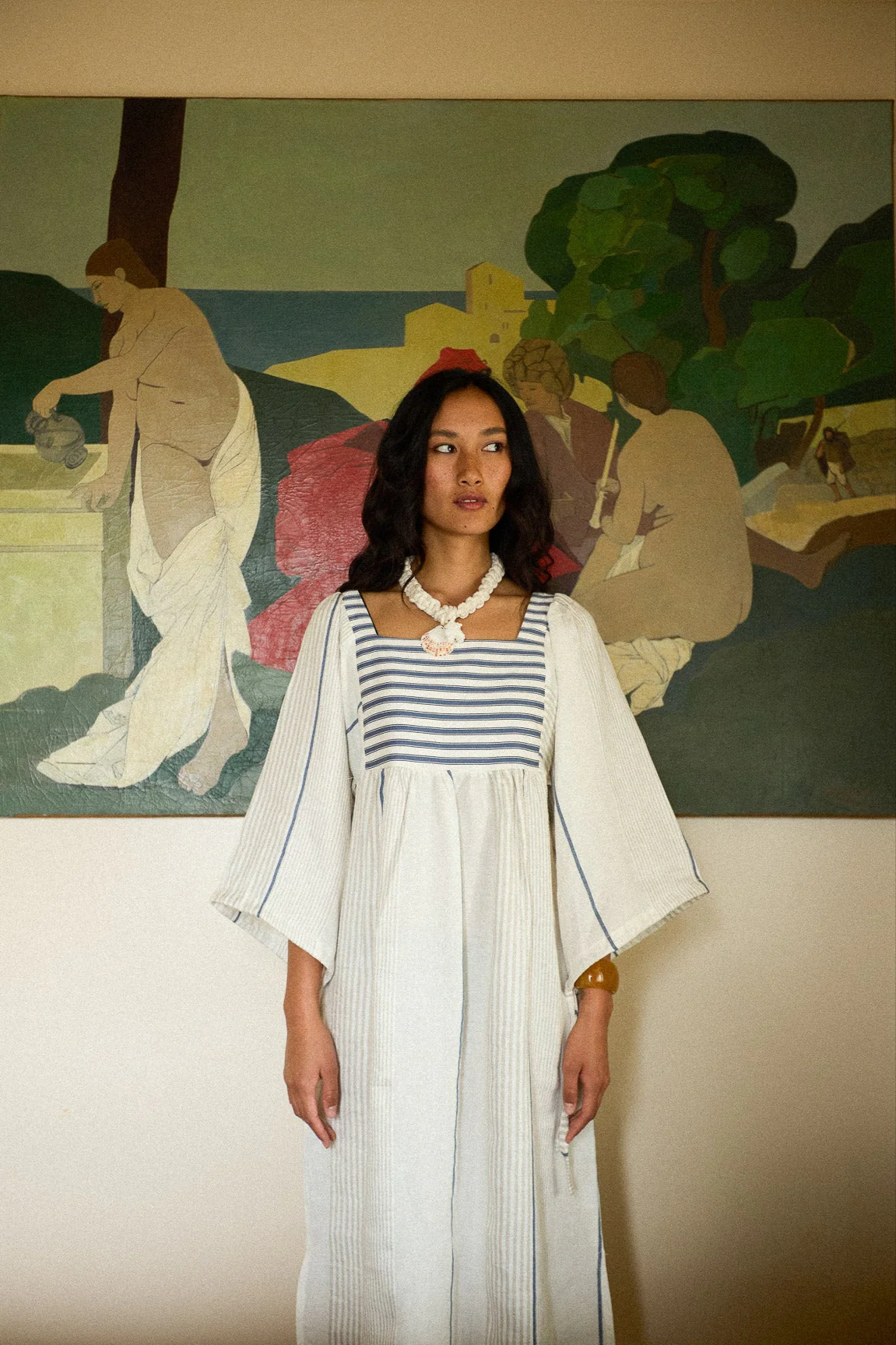 El vestido Kai está confeccionado en varios tejidos. Es un vestido largo de escote cuadrado con un corte en el pecho, esta pieza está formada por un tejido de rayas en azul marino 100% algodón. Las mangas son largas con sisa holgada desde el pecho, la falda se une a la parte superior mediante un frunce delantero y trasero en un tejido 100% lino en rayas gris y azul marino. Además cuenta con bolsillos y aberturas laterales. Su estilo elegante pero informal hará que sea el vestido que quieras llevar todos los días.
