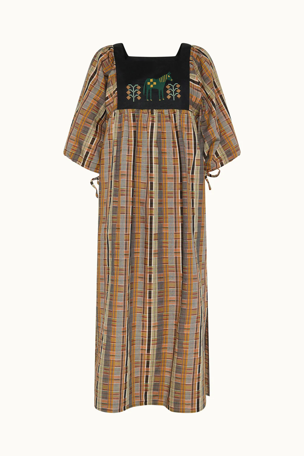 Vestido largo con escote cuadrado y corte en el pecho negro. Cuerpo y mangas holgadas. Bolsillos y aberturas laterales. Pecho en estampado de caballos. Su estilo elegante pero informal hará que sea el vestido que quieras llevar todos los días.