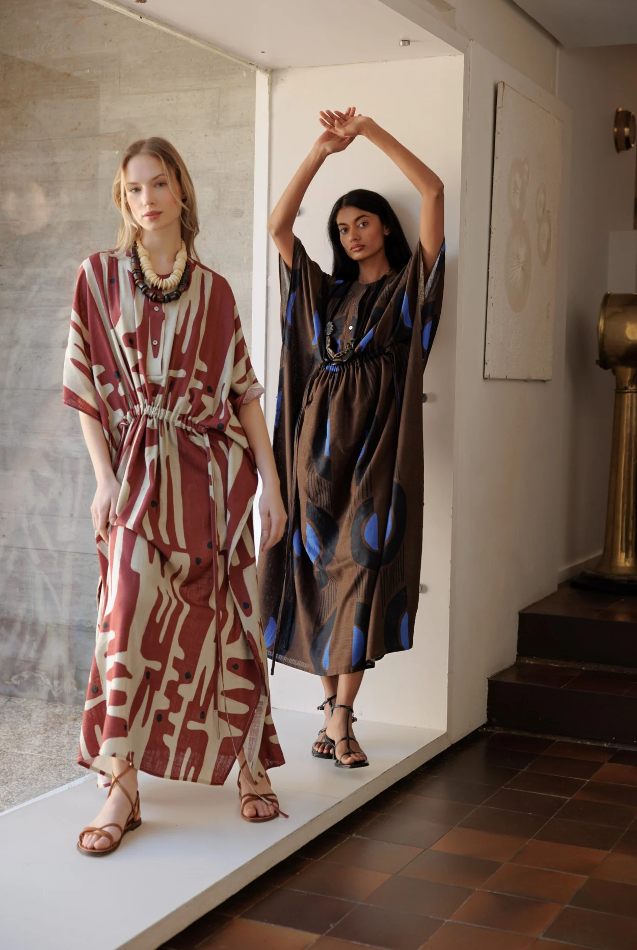 El kaftan Pekelo es una de las mejores apuestas de nuestra nueva colección. Su escote en pico alarga visualmente el cuello y su delantero ajustable permite que te lo puedas ceñir como más te guste según te apetezca.