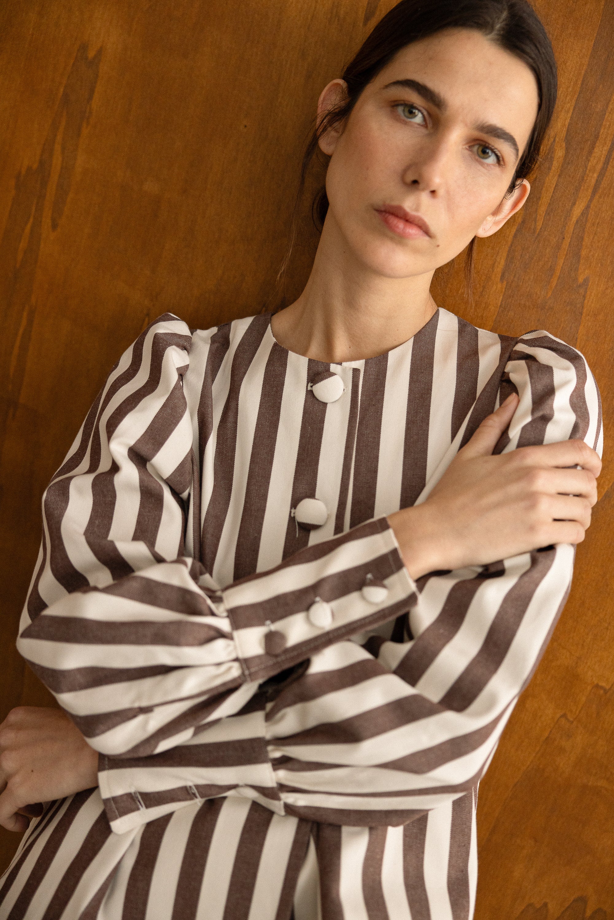 Sobrecamisa confeccionada en 100% algodón con mangas abullonadas y terminadas en puño. Cierre con botones con el mismo tejido en el delantero que le aportan elegancia a la pieza. Con estampado de rayas crema y marrón. Una prenda perfecta para cualquier ocasión.