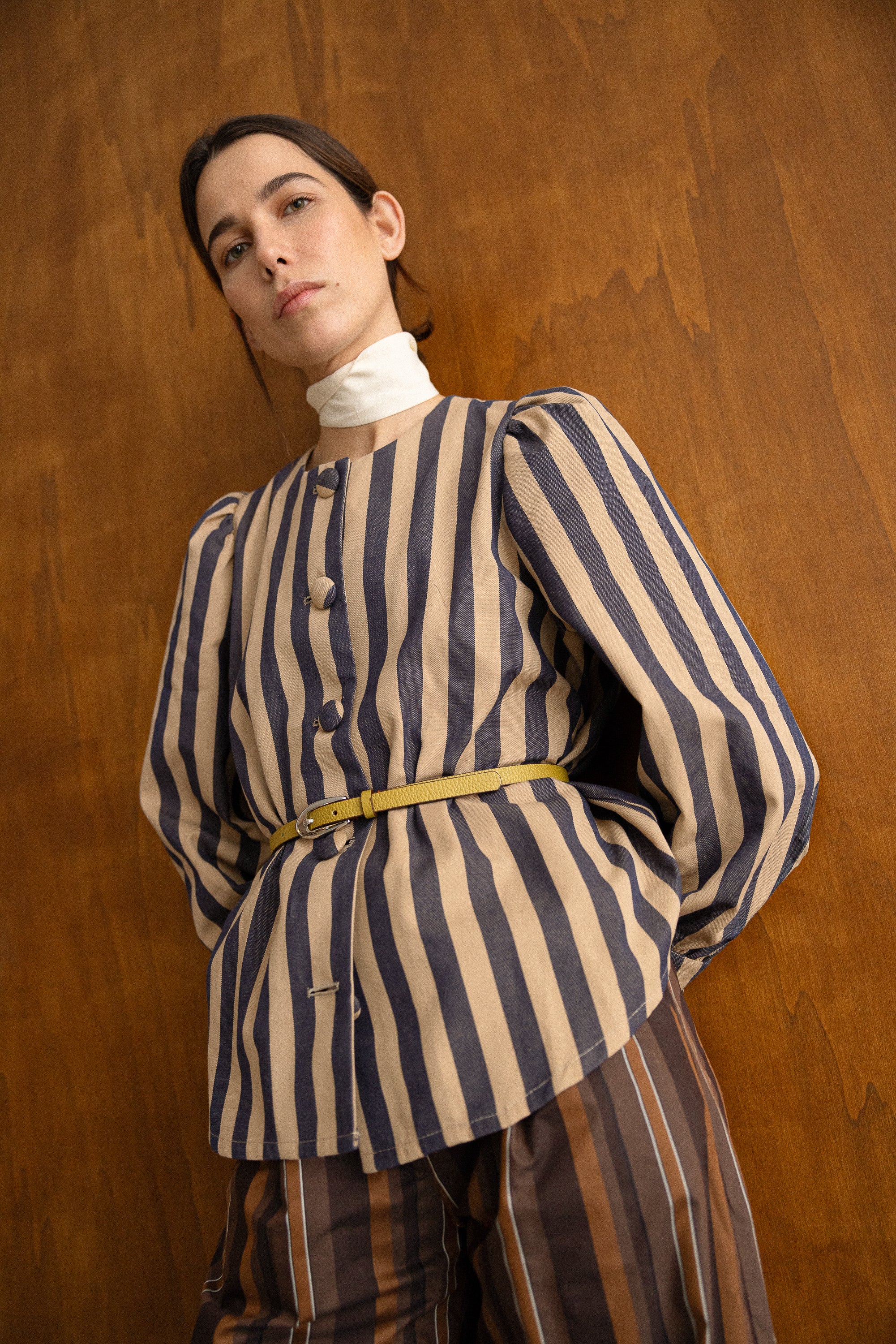 Sobrecamisa confeccionada en 100% algodón con mangas abullonadas y terminadas en puño. Cierre con botones con el mismo tejido en el delantero que le aportan elegancia a la pieza. Con estampado de rayas beige y azul. Una prenda perfecta para cualquier ocasión.